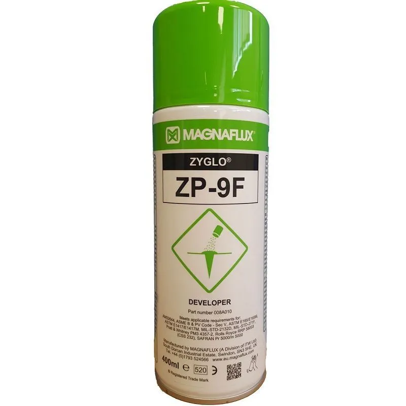 Быстросохнущий безводный проявитель Zyglo ZP-9F состоит из взвеси частиц белого цвета в смеси изопропилового спирта и ацетона.Zyglo ZP-9F образует матовое белое покрытие на поверхности контролируемого изделия и может испольхзоваться с пенетрантами семейств Spotcheck и Zyglo. Быстросохнущий безводный проявитель Zyglo ZP-9F не содержит серы, галогенов и хлорированных углеводородов.